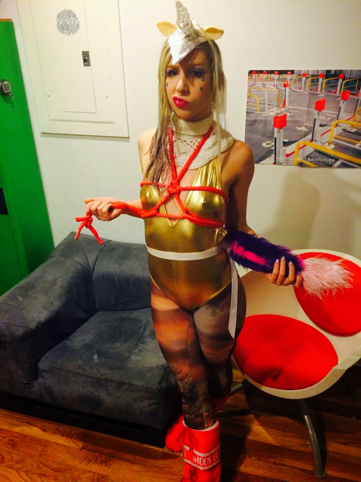 A few weeks ago, a friend invited me to an event called I Feel … Unicorn Planet. Knowing everyone was going to go as a unicorn, I yawned, “How cliché! I want to wear something no one’s ever seen or worn at a party like this.” Therefore even I was shocked when I had the sudden impulse to go as a unicorn after all—a unicorn harnessed, on a leash, crying rhinestone tears (which, according to legend, can heal any illness). I made the entire fascinator myself that day with a horn I’d made out of cut, sand-blasted, heated, and twisted sheet acrylic; glow-in-the-dark ears of Sculpey; and some cardboard and fabric. I also added synthetic hair for effect. The costume incorporates a low-cut American Apparel onesie in gold, because pink is too obvious and gold is rare and royal, a pink and purple tail my friend Stace Cadet gave me at Burning Man last year, a soft white knit dickie found in the children’s section of a thrift store, wintery tights from Denmark, and MoonBoots that perfectly match the synthetic rope I used for my harness and leash. This way I have elements of the Sparkle Pony aesthetic, but I have made the male gaze the subject of the piece.